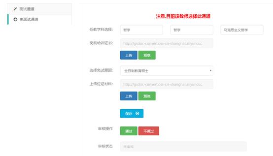 2.属于“符合师范教育类专业毕业生特许条款”申请免面试的,任教学科须与本科毕业证上载明的所学专业一致,否则还须申请面试。如需参加面试的,请先根据“免面试通道”完成报名,具体更改工作由学校管理员在审核环节负责完成;