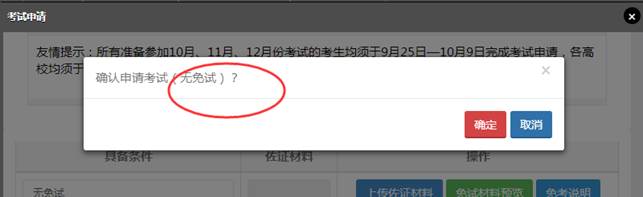 2)申请免考的人员,请先阅读“免考说明”,根据学校有关规定和个人实际情况,点击“具备条件”下方“无免试”处,选择您要免考的类型,然后点击“上传佐证材料”(所有免试材料须编辑为一个PDF文档)。上传之后,考生可以预览上传的免试材料是否清晰、完整。如无其他问题,点击“确认申请”即可。