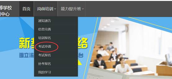 1.登录山东省高等学校师资培训中心官网(http://www.gspxzx.sdnu.edu.cn/),点击右下角“山东省高校教师培训管理系统”,登录之后,点击“岗前培训”,点击“考试申请”。如下图: