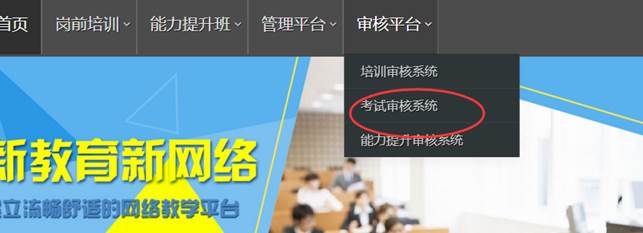 1)登录山东省高等学校师资培训中心官网(http://www.gspxzx.sdnu.edu.cn/),点击右下角“山东省高校教师培训管理系统”,登录之后,点击“审核平台”,点击“考试审核系统”。如下图: